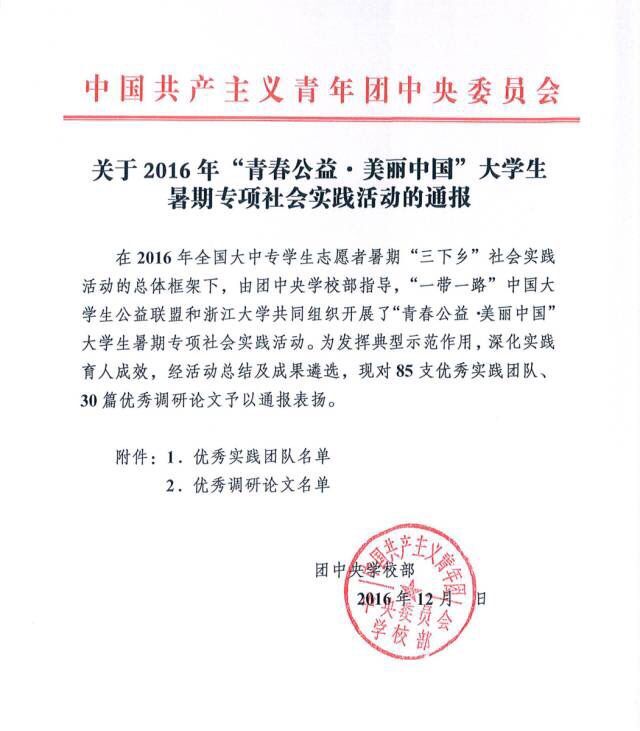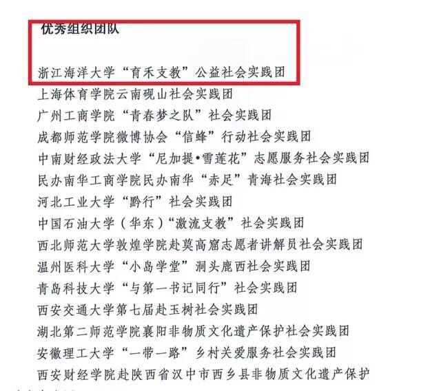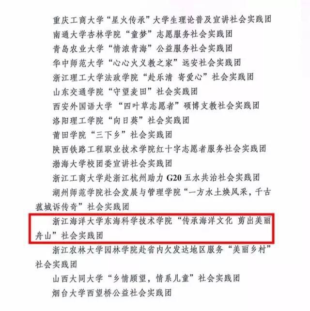 在2016年全国大中专学生志愿者暑期“三下乡”社会实践活动的总体框架下,由团中央学校部指导,“一带一路”中国大学生公益联盟和浙江大学共同组织开展的“青春公益·美丽中国”大学生暑期专项社会实践活动评奖结果近日揭晓。我校“育禾支教”公益社会实践团(指导老师:数理与信息学院:任杭璐)、“传承海洋文化、剪出美丽舟山”公益社会实践团(指导老师:港航与交通运输工程学院:严敏慧)等2支团队获得“全国优秀组织团队”称号。