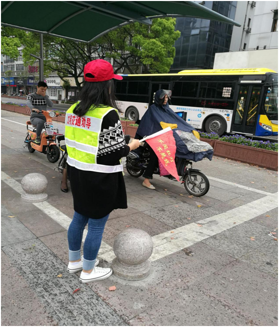 志愿者们身穿荧光马甲,早早地到达目的地——文化广场。在活动开始前,志愿者们先是接受了简单的培训,紧接着便开始交通秩序维护志愿活动。由于处在上班高峰,车流量大,志愿者不仅要挥舞旗帜、劝导行人文明行车过马路,还要保护好自身安全,以防受伤。对于劝导过程中遇到闯红灯、不走斑马线的行人,志愿者会拦下他,并对其讲解相关的交通知识,指明此举的危险性,并劝解其不要再有此不文明的行为。