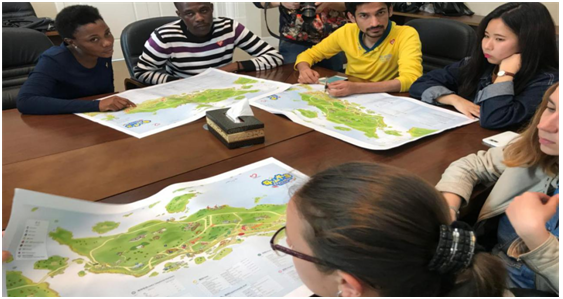 4月25日中午,舟山团市委郑丹部长及志愿者带着由国际志愿者手绘的双语地图初稿会见了浙江海洋大学留学生询问意见,外国语学院志愿者吕薇、钟莉芬全程陪同翻译。这份特殊的地图包括了舟山本岛、普陀和朱家尖岛,有汉语、英语双重注解,并增加了酒店、码头、景点等的详细注释。郑部长请留学生仔细观看,询问他们是否实用、符合他们的阅读习惯;志愿者与留学生们讨论地图上有哪些需要改进的地方及如何改进,并得到了积极反馈。