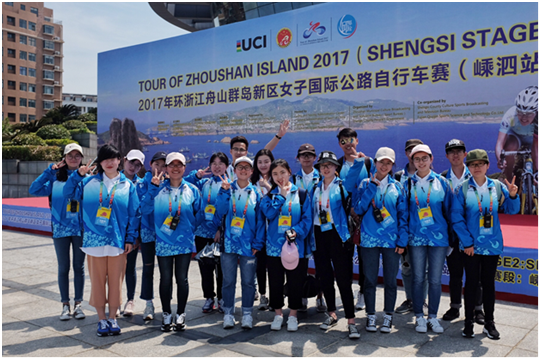 5月10—12日,2017年环舟山群岛新区女子国际公路自行车赛在嵊泗列岛顺利举行。此次比赛由国家体育总局自行车击剑运动管理中心、浙江省体育局、舟山市人民政府共同主办,来自世界各地的十五支国际顶尖的自行车队参与了此项赛事。浙江海洋大学外国语学院派出20名大学生志愿者全程为该项赛事提供翻译服务。