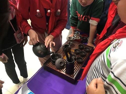 无我茶文化社团成员向小学生介绍关于茶具的基本知识以及《茶经》中的经典语段,随后另一名身着汉服的社员现场演示十三道茶道的全过程:烫杯、温壶、马龙入宫……分杯后,社员请参与的学生们品茗并邀请他们亲身体验茶道的乐趣。在现场志愿者的协助下,学生们成功泡制出一壶壶清香的红茶。通过茶道,社团成员向在场的学生们阐述了做事用心,处事圆滑,尊重他人,谦虚有礼的人生道理。