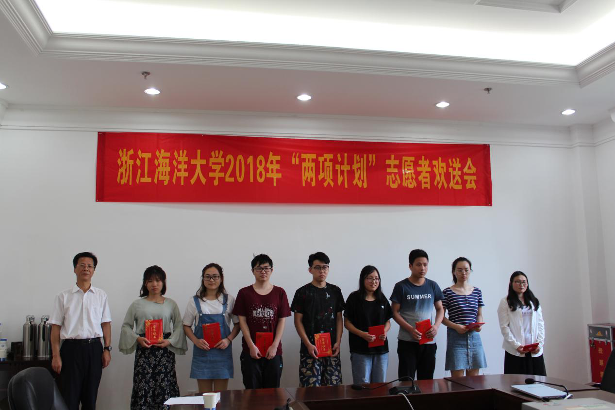 6月21日下午,浙江海洋大学举行2018年“两项计划”志愿者欢送会,会议由校团委书记王湖滨主持,校党委副书记吴中平出席会议并讲话,14名入选“两项计划”志愿者及相关学院学生工作负责人、团委书记等出席了欢送会。